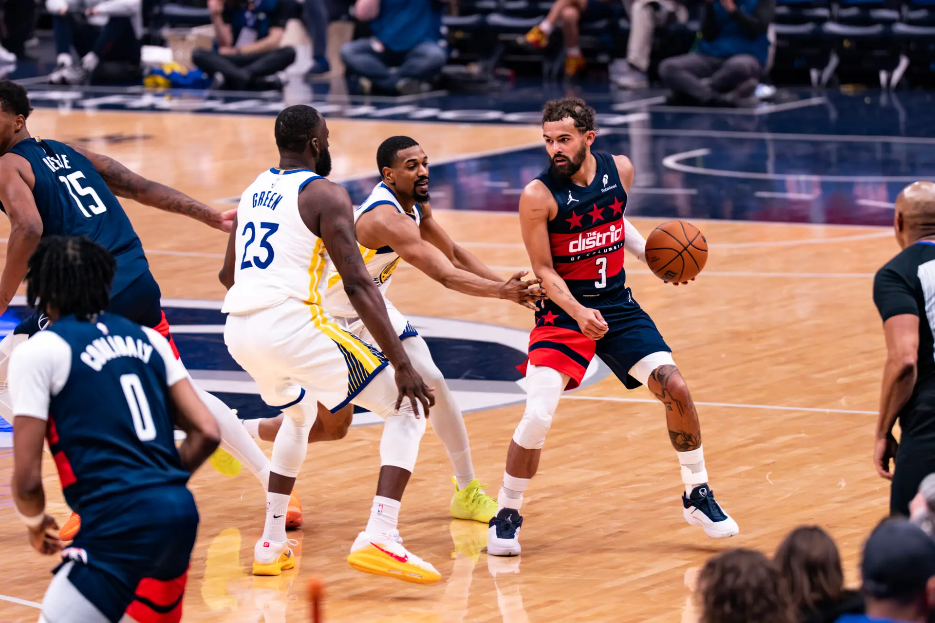 Washington struck first when Riley scored the opening basket, but Golden State responded quickly when Draymond Green answered with a three-pointer. Early in the quarter, tensions rose when Juju Reese and Draymond Green exchanged words after an elbow during a drive in the paint. Reese picked up three fouls in the first quarter.